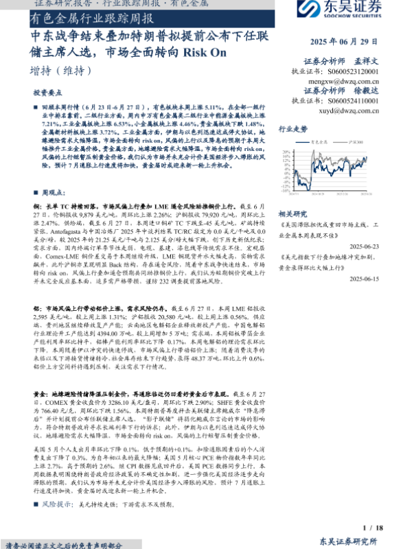 【东吴证券】【20250629】有色金属行业跟踪周报:中东战争结束叠加特朗普拟提前公布下任联储主席人选,市场全面转向Risk On-18页 证券期货研究报告