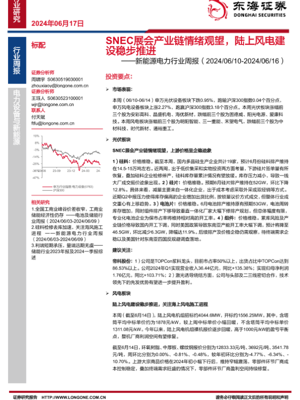 【东海证券】【20240617】20240617-东海证券-新能源电力行业周报:SNEC展会产业链情绪观望,陆上风电建设稳步推进-17页 行业研究