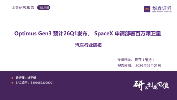 【华鑫证券】【202602】汽车行业周报:Optimus Gen3预计26Q1发布,SpaceX申请部署百万颗卫星-38页 证券期货研究报告