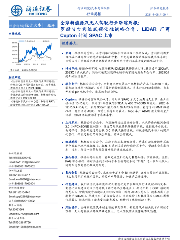 【海通证券】【20210809】全球新能源及无人驾驶行业跟踪周报:罗姆与吉利达成碳化硅战略合作,LiDAR厂商Cepton计划SPAC上市-2页 行业研究