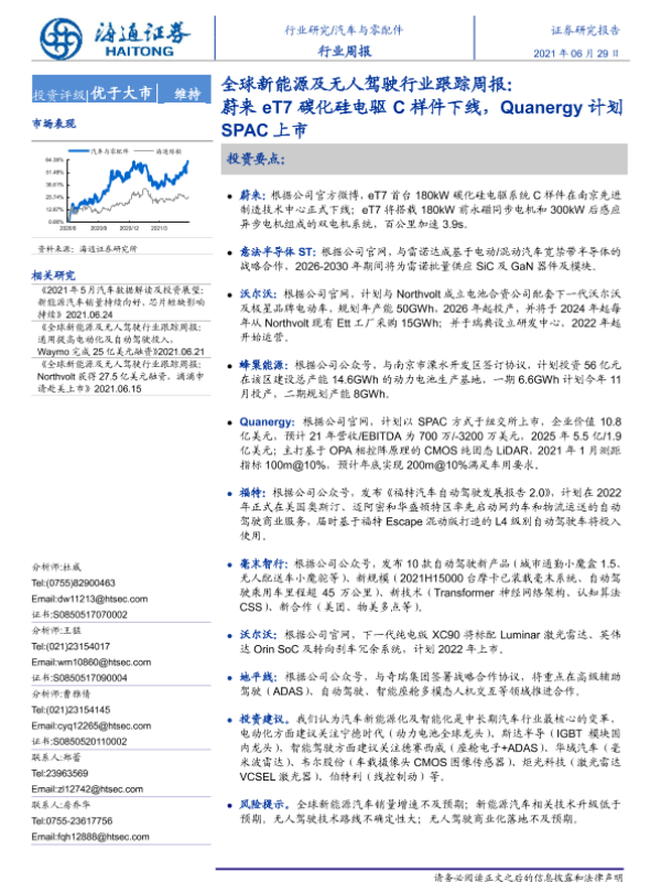 【海通证券】【20210629】全球新能源及无人驾驶行业跟踪周报:蔚来eT7碳化硅电驱C样件下线,Quanergy计划SPAC上市-2页 行业研究