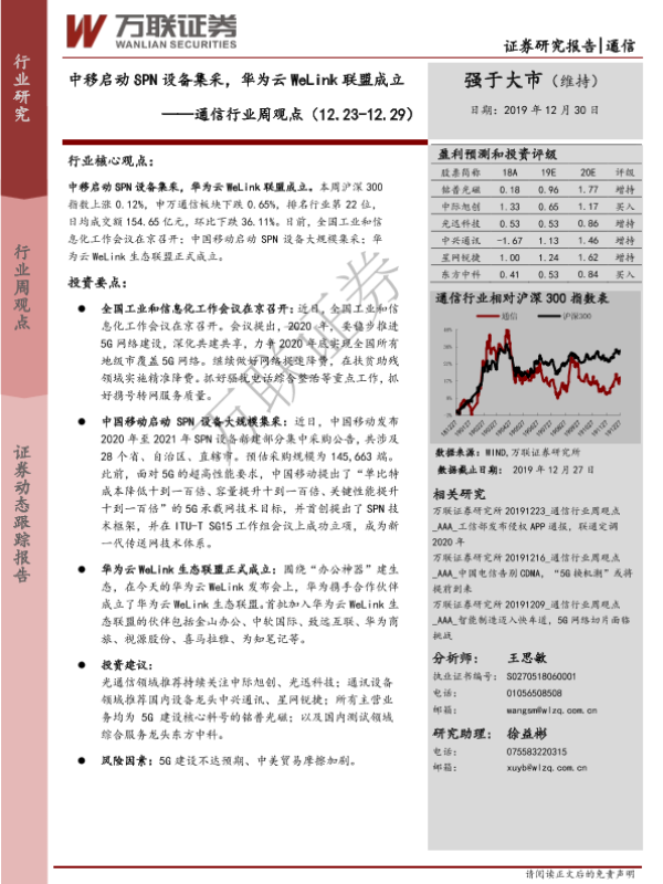 【万联证券】【20191230】20191230-万联证券-通信行业周观点:中移启动SPN设备集采,华为云WeLink联盟成立-11页 行业研究