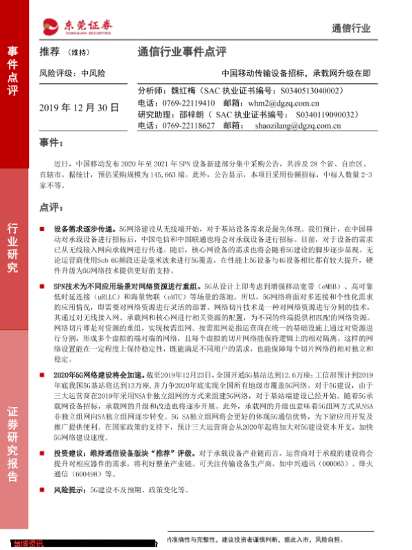 【东莞证券】【20191230】20191230-东莞证券-通信行业事件点评:中国移动传输设备招标,承载网升级在即-2页 行业研究