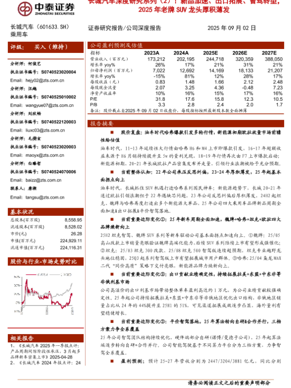 【中泰证券】【202509】长城汽车深度研究系列(2):新品加速、出口拓展、智驾转型, 2025年老牌 SUV龙头厚积薄发-33页 证券期货研究报告