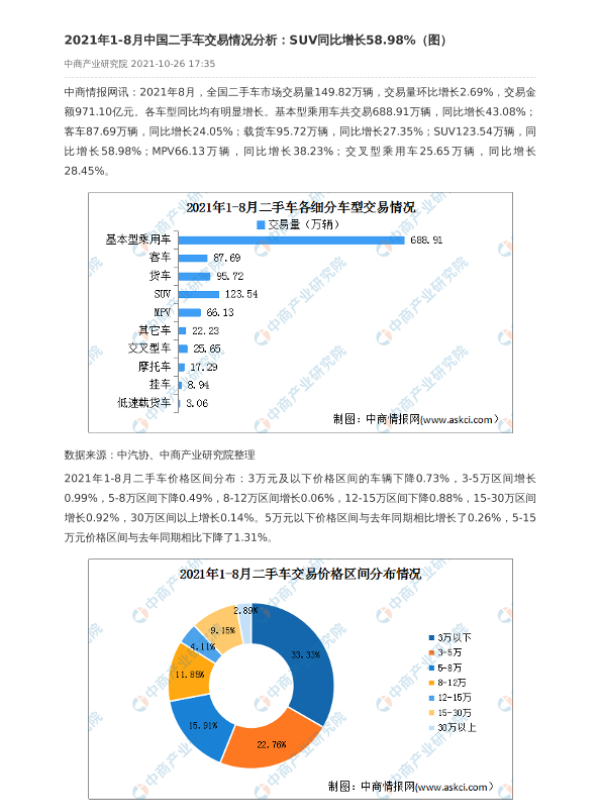 【中商产业研究院】【2021】2021年1-8月中国二手车交易情况分析-2页 行业研究