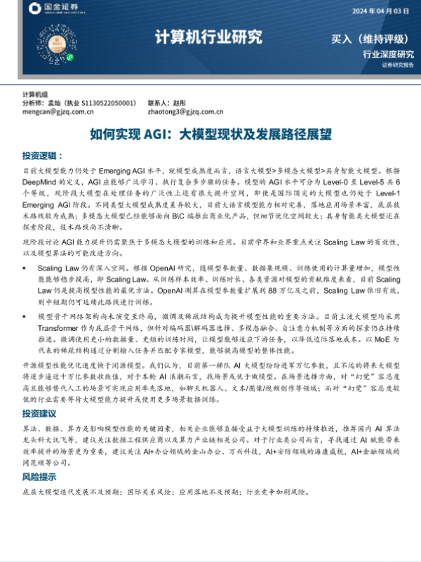 【国金证券】【20240405】计算机行业研究-如何实现AGI-大模型现状及发展路径展望-26页 行业研究