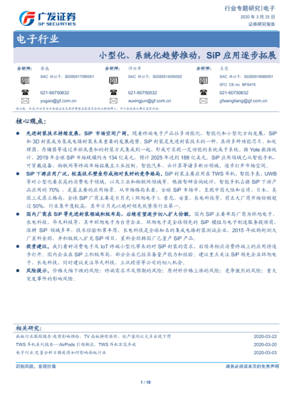 【广发证券】【20200325】电子行业:小型化、系统化趋势推动,SiP应用逐步拓展-20页 行业研究