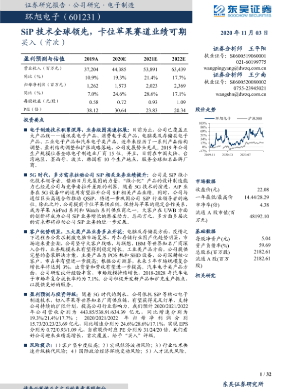 【东吴证券】【20201103】环旭电子-SiP技术全球领先,卡位苹果赛道业绩可期-32页 行业研究