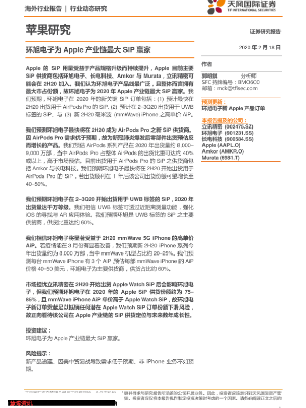 【天风国际证券】【20200218】苹果研究:环旭电子为Apple产业链最大SiP赢家-3页 行业研究