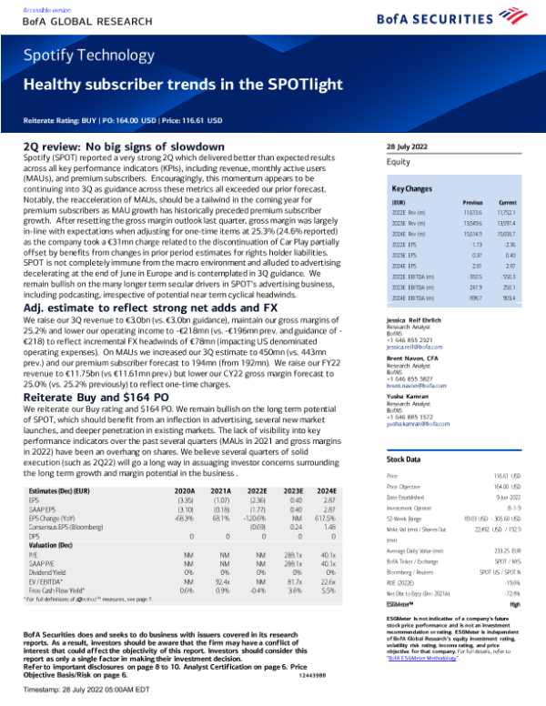 【BofA Securities】【20220728】Spotify Technology Healthy subscriber trends in the SPOTlight-10页 行业研究