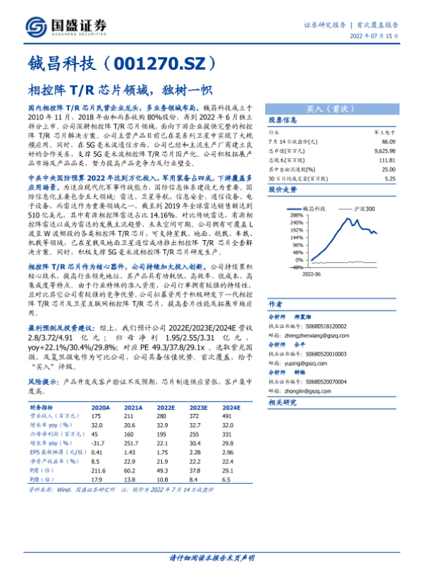【国盛证券】【20220715】铖昌科技(001270.SZ):相控阵T/R芯片领域,独树一帜-20页 行业研究