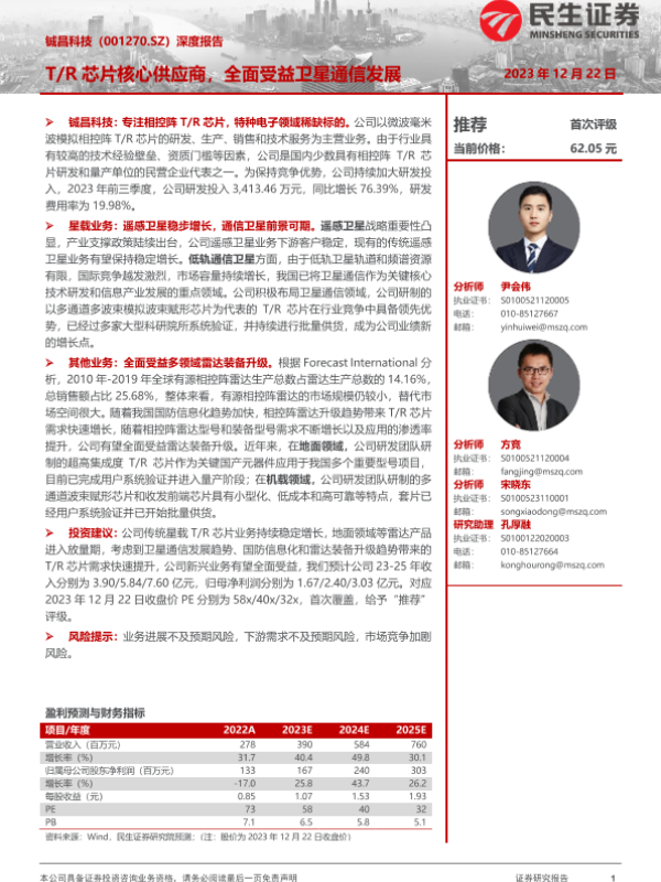 【民生证券】【20231222】铖昌科技-001270.SZ-深度报告:T/R芯片核心供应商,全面受益卫星通信发展-28页 行业研究