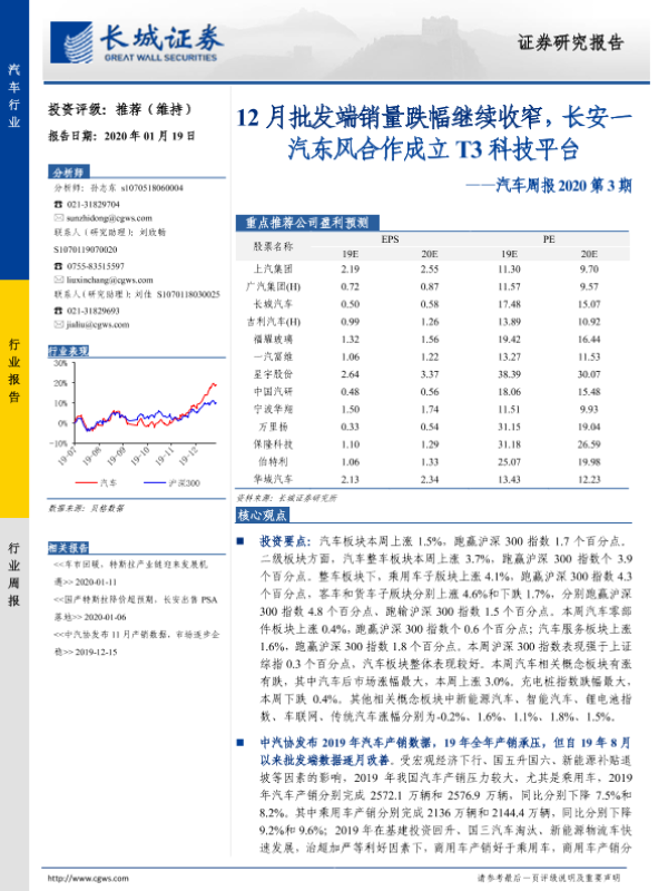 【长城证券】【20200119】汽车周报2020第3期:12月批发端销量跌幅继续收窄,长安一汽东风合作成立T3科技平台-14页 行业研究
