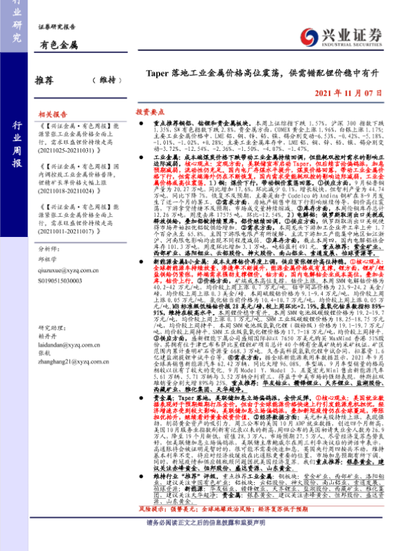 【兴业证券】【20211107】20211107-兴业证券-有色金属行业周报:Taper落地工业金属价格高位震荡,供需错配锂价稳中有升-23页 行业研究