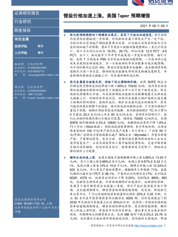 【信达证券】【20210808】20210808-信达证券-有色金属周度报告:锂盐价格加速上涨,美国Taper预期增强-11页 行业研究