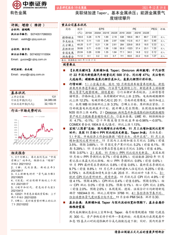 【中泰证券】【20211219】20211219-中泰证券-有色金属行业周报:美联储加速Taper,基本金属承压;能源金属景气度继续攀升-46页 行业研究