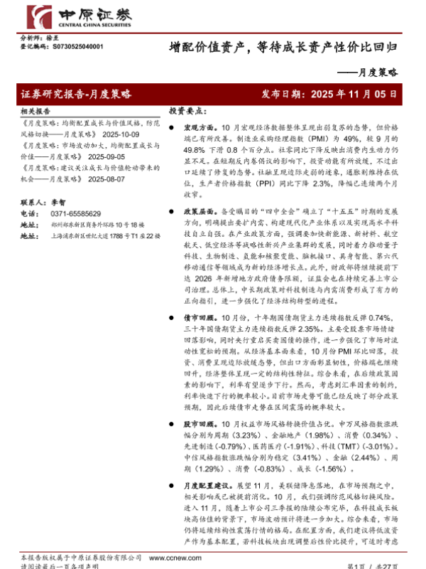 【中原证券】【202511】增配价值资产,等待成长资产性价比回归——月度策略-27页 证券期货研究报告