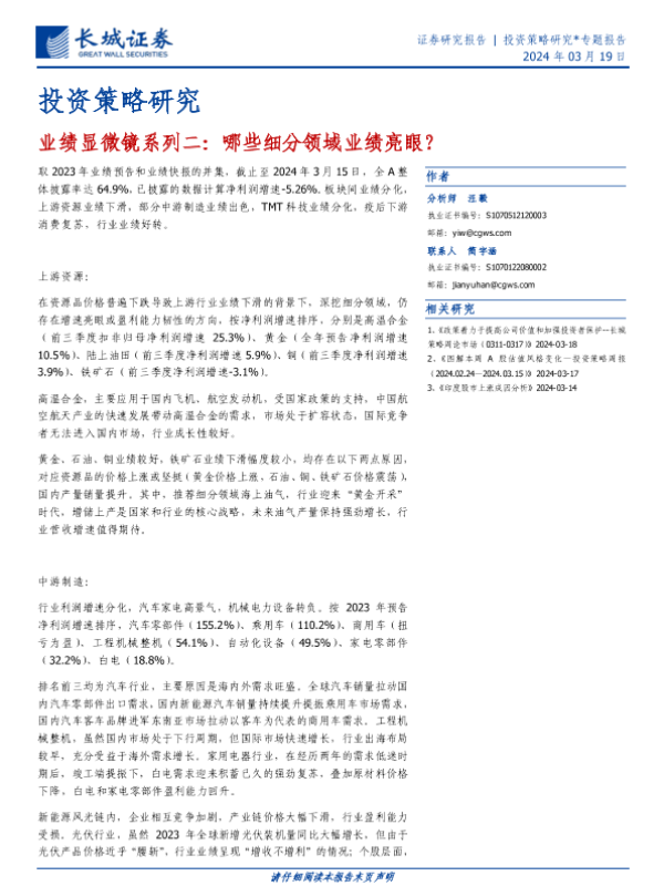 【长城证券】【20240319】投资策略研究-业绩显微镜系列二:哪些细分领域业绩亮眼?-13页 行业研究