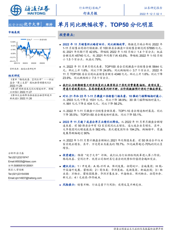 【海通证券】【20221202】房地产行业月报:单月同比跌幅收窄,TOP50分化明显-11页 行业研究