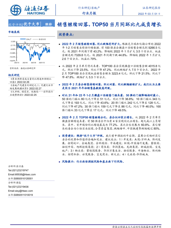 【海通证券】【20220301】房地产行业月报:销售继续回落,TOP50当月同环比九成负增长-10页 行业研究