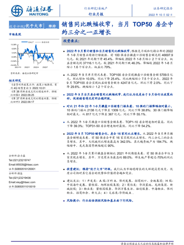 【海通证券】【20221002】房地产行业月报:销售同比跌幅收窄,当月TOP50房企中约三分之一正增长-10页 行业研究