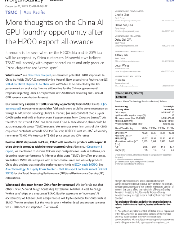 【Morgan Stanley】【202512】More thoughts on the China Al GPU foundry opportunity after the H200 export allowance-6页 证券期货研究报告