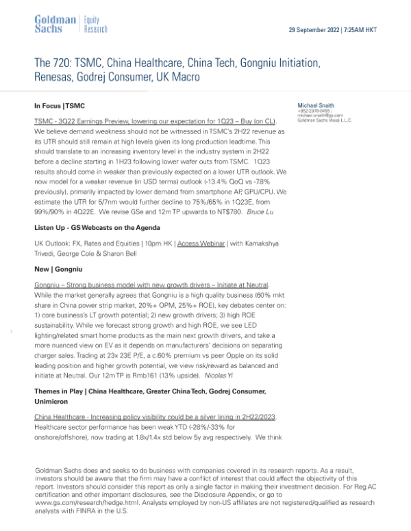 【Goldman Sachs】【20220929】The 720 TSMC, China Healthcare, China Tech, Gongniu Initiation, Renesas, Godrej Consumer, UK Macro-8页 行业研究