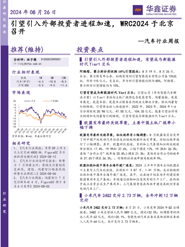 【华鑫证券】【20240826】20240826-华鑫证券-汽车行业周报:引望引入外部投资者进程加速,WRC2024于北京召开-15页 行业研究