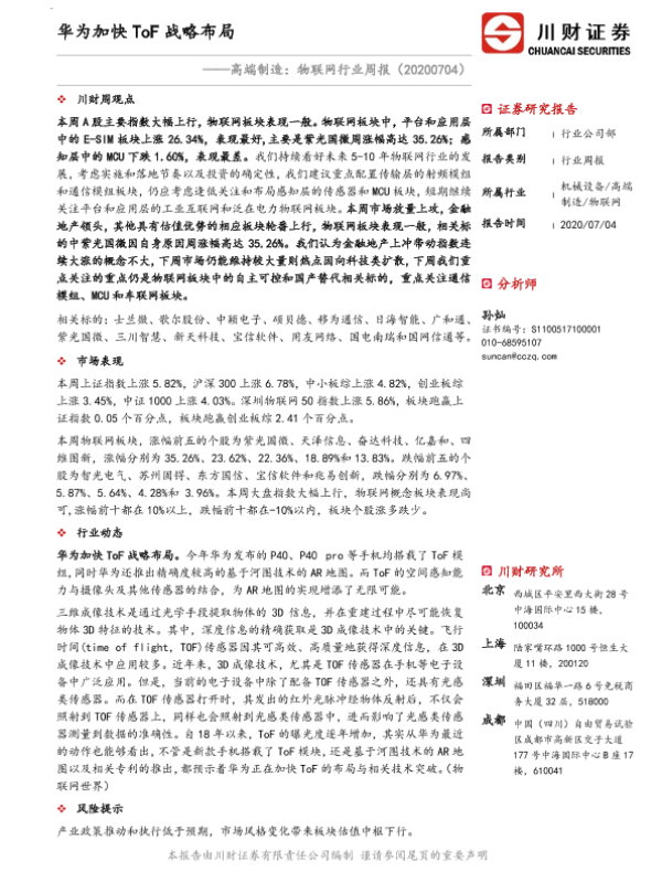 【川财证券】【20200704】高端制造:物联网行业周报:华为加快ToF战略布局-18页 行业研究