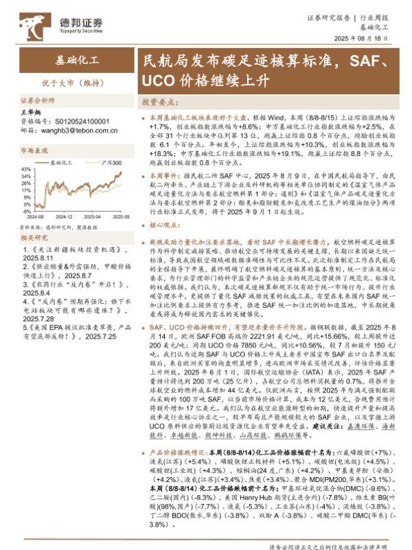 【德邦证券】【20250818】基础化工行业周报:民航局发布碳足迹核算标准-SAF、UCO价格继续上升-41页 证券期货研究报告