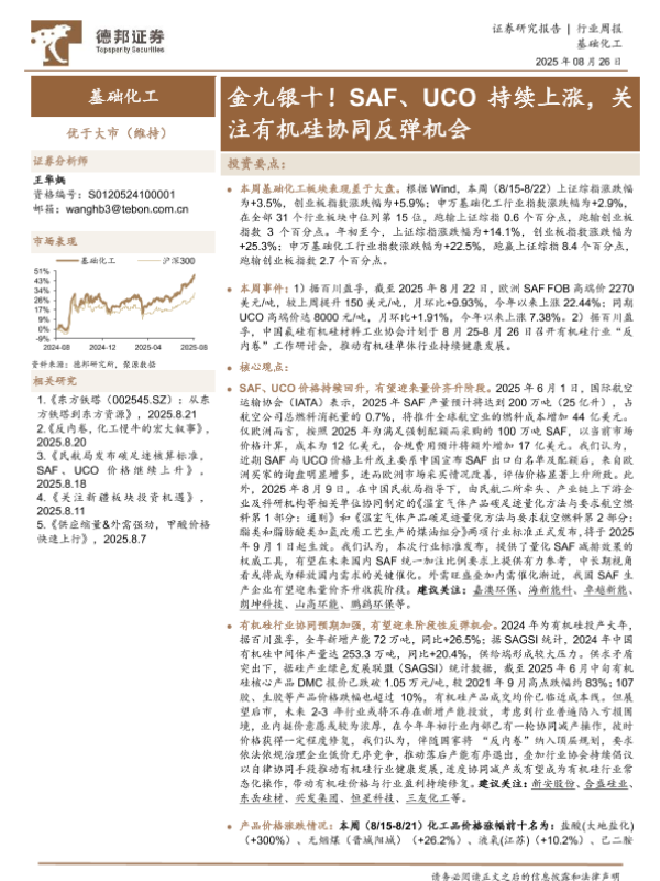 【德邦证券】【20250826】基础化工行业周报:金九银十!SAF、UCO持续上涨,关注有机硅协同反弹机会-42页 证券期货研究报告