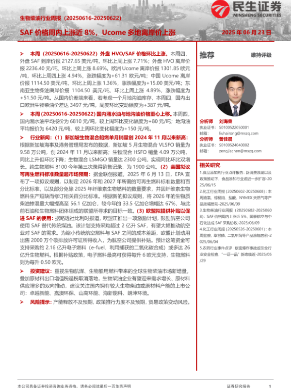 【民生证券】【20250623】生物柴油行业周报_SAF价格周内上涨近8_Ucome多地离岸价上涨-7页 证券期货研究报告