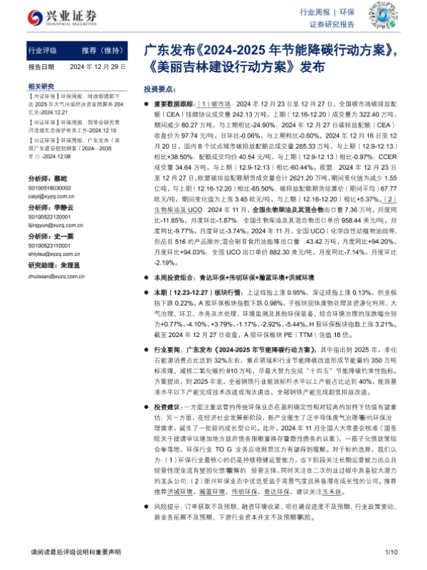 【兴业证券】【20241229】环保行业周报:广东发布《2024-2025年节能降碳行动方案》,《美丽吉林建设行动方案》发布-10页 行业研究
