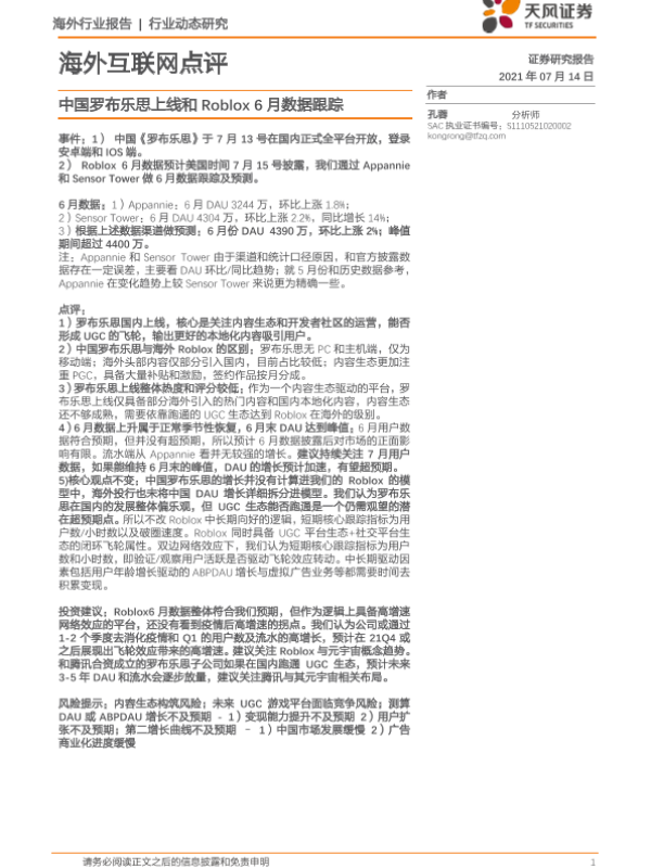 【天风证券】【20210714】海外互联网点评:中国罗布乐思上线和Roblox6月数据跟踪-8页 行业研究