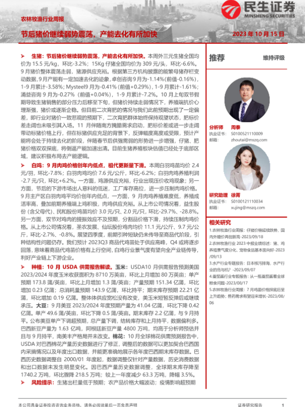 【民生证券】【20231015】20231015-民生证券-农林牧渔行业周报:节后猪价继续弱势震荡,产能去化有所加快-13页 行业研究