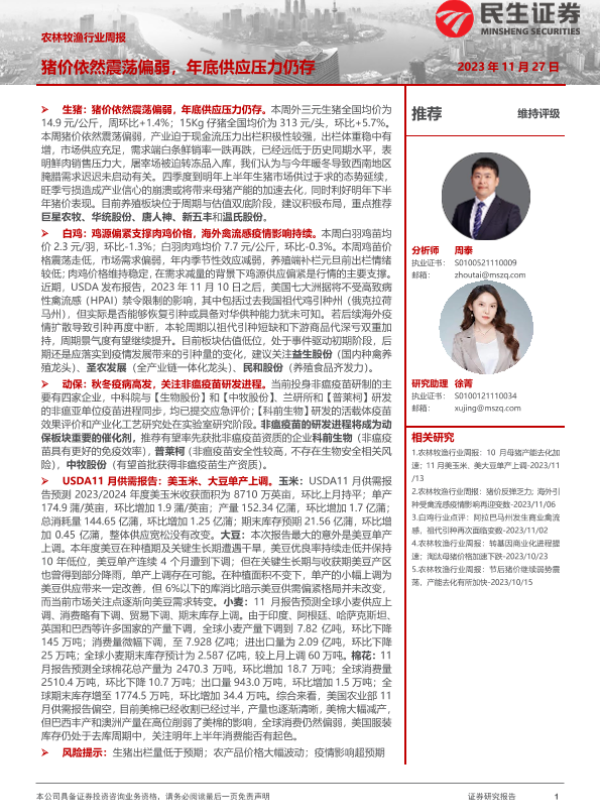 【民生证券】【20231127】20231127-民生证券-农林牧渔行业周报:猪价依然震荡偏弱,年底供应压力仍存-17页 行业研究