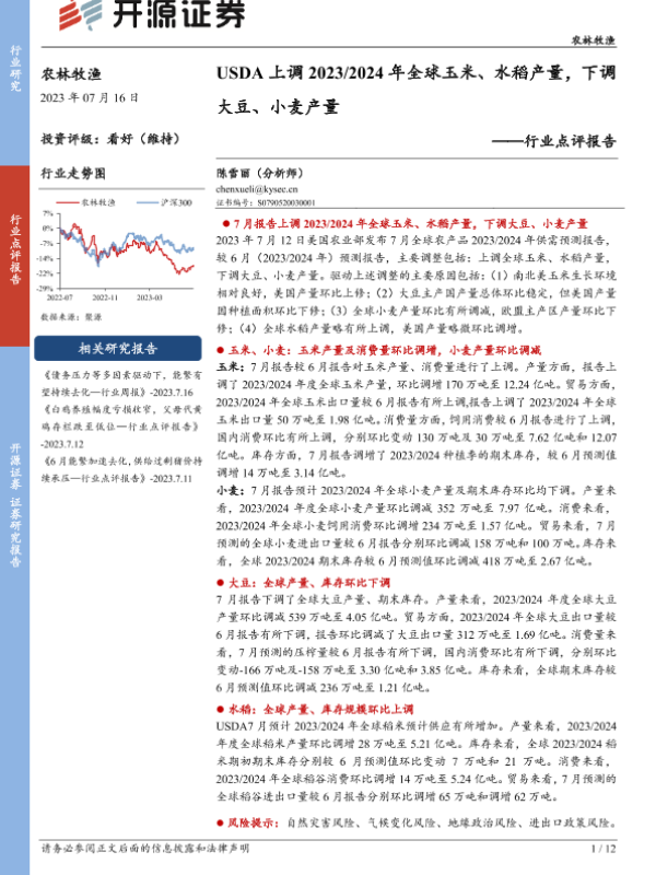 【开源证券】【20230716】USDA上调2023 2024年全球玉米、水稻产量,下调大豆、小麦产量-12页 行业研究