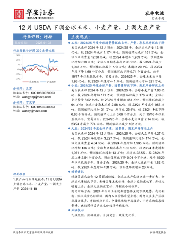 【华安证券】【20250102】12月USDA下调全球玉米、小麦产量,上调大豆产量-16页 行业研究
