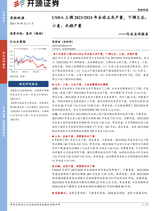 【开源证券】【20230917】USDA上调2023 2024年全球玉米产量,下调大豆、小麦、水稻产量-13页 行业研究