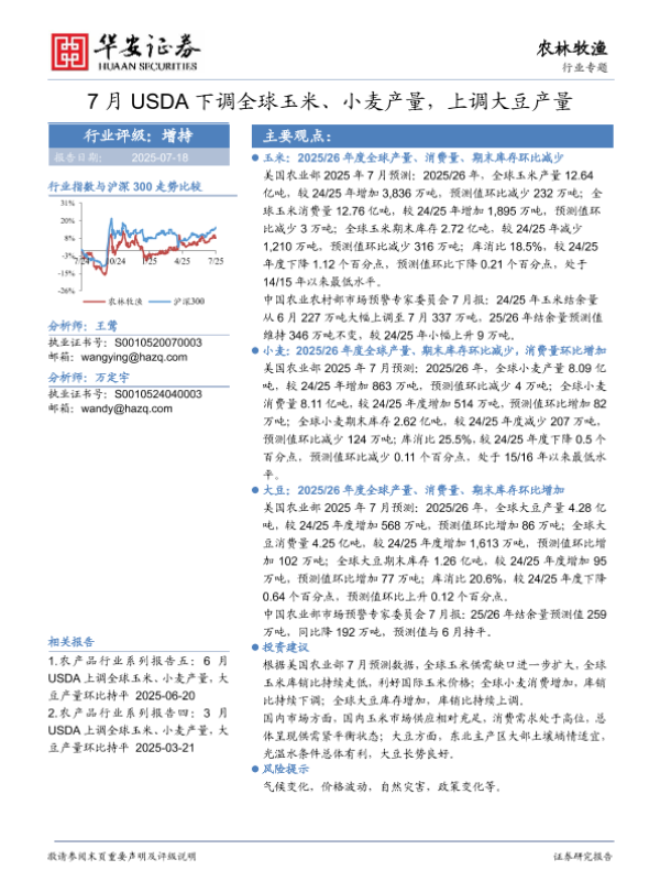【华安证券】【20250718】7月USDA下调全球玉米、小麦产量,上调大豆产量-16页 行业研究