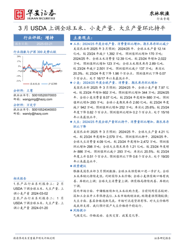 【华安证券】【20250321】3月USDA上调全球玉米、小麦产量,大豆产量环比持平-16页 行业研究