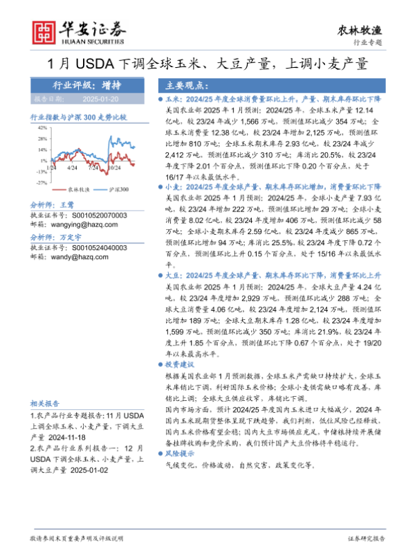 【华安证券】【20250120】1月USDA下调全球玉米、大豆产量,上调小麦产量-16页 行业研究