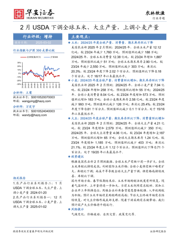 【华安证券】【20250302】2月USDA下调全球玉米、大豆产量,上调小麦产量-16页 行业研究