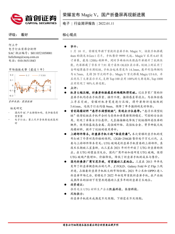 【首创证券】【20220111】荣耀发布Magic V,国产折叠屏再现新进展-2页 行业研究