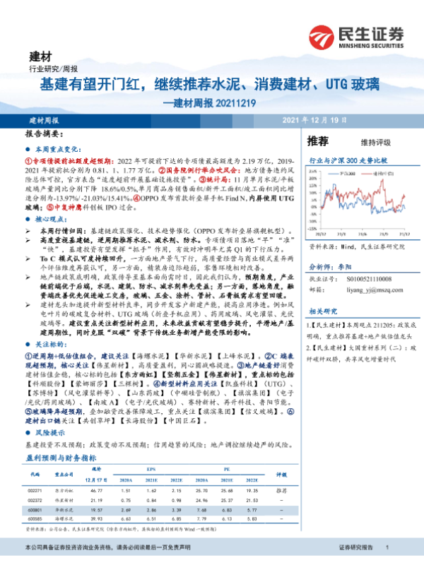 【民生证券】【20211219】建材周报:基建有望开门红,继续推荐水泥、消费建材、UTG玻璃-21页 行业研究