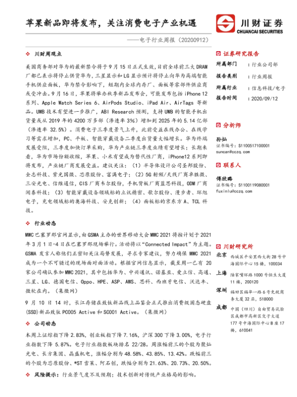 【川财证券】【20200912】20200912-川财证券-电子行业周报:苹果新品即将发布,关注消费电子产业机遇-10页 行业研究