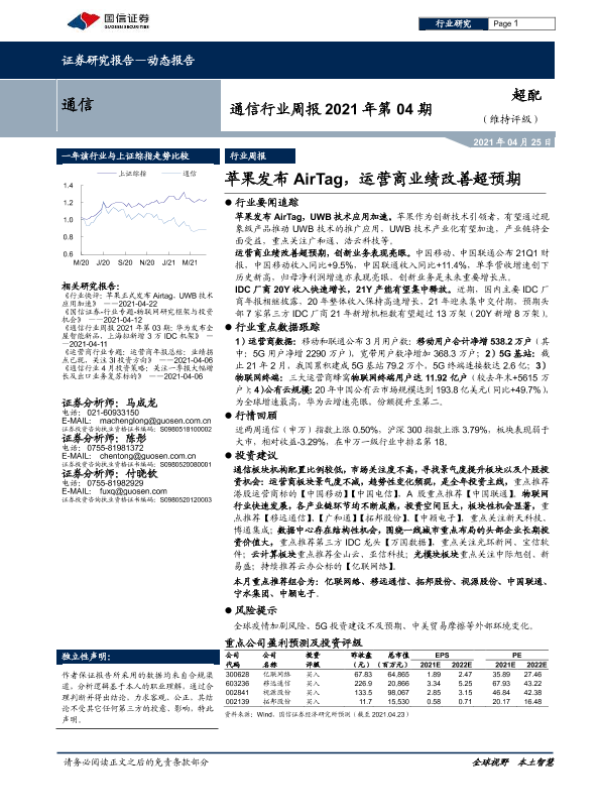 【国信证券】【20210425】通信行业周报2021年第04期:苹果发布AirTag,运营商业绩改善超预期-16页 行业研究