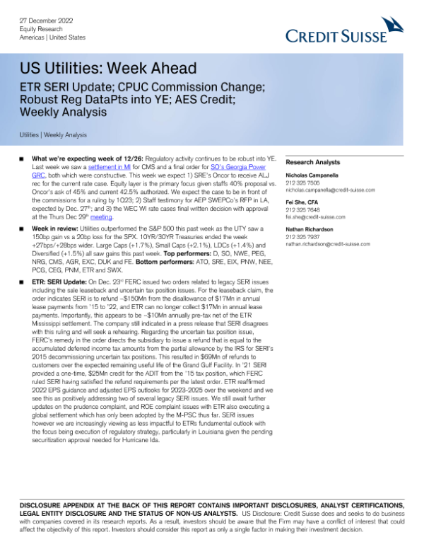 【Credit Suisse】【20221227】US Utilities Week Ahead-14页 行业研究