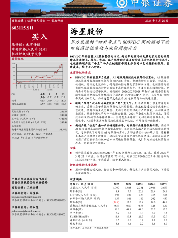 【中银证券】【202603】算力底座的“材料奇点”:800VDC架构驱动下的电极箔价值重估与涨价周期开启-21页 证券期货研究报告