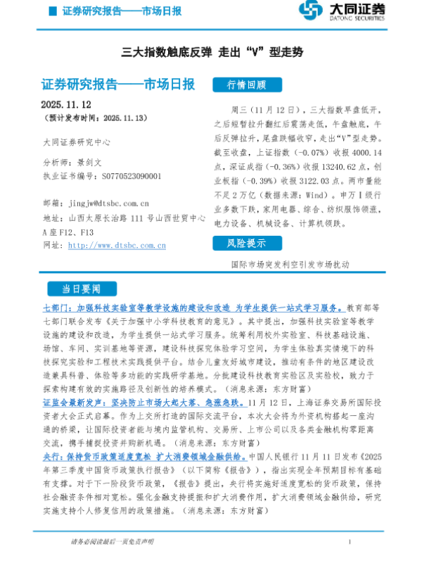 【大同证券研究中心】【202511】市场日报——三大指数触底反弹 走出“V”型走势-5页 证券期货研究报告